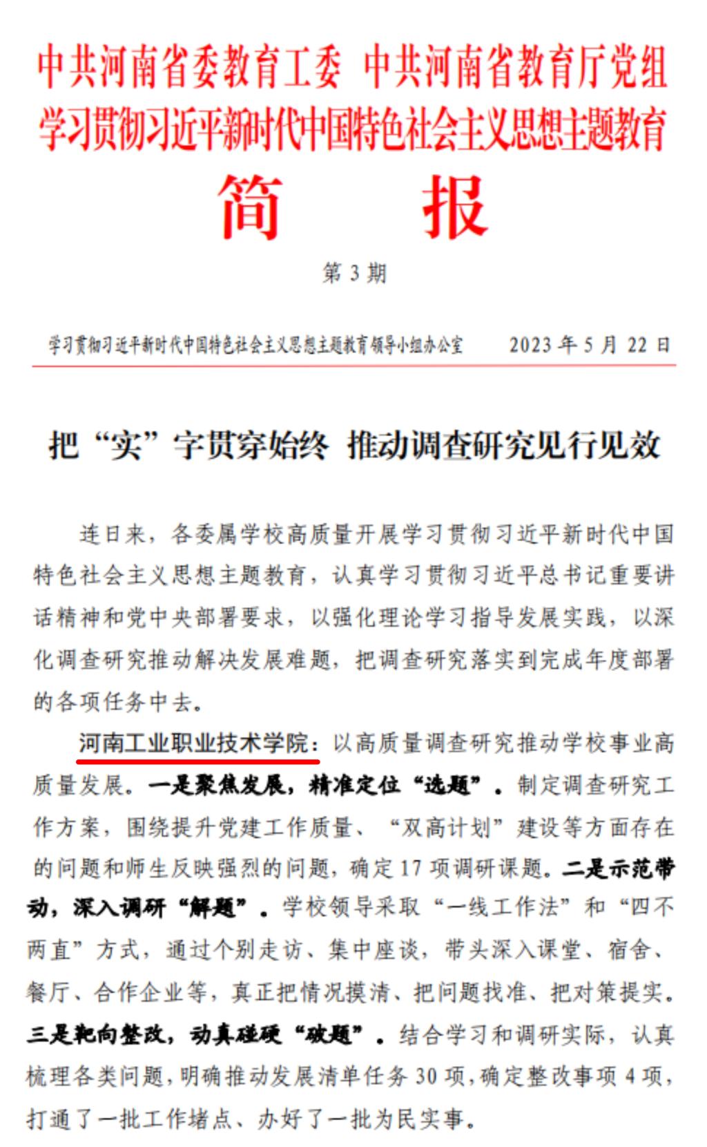 近日,河南省委教育工委、省教育厅党组学习贯彻习近平新时代中国特色社会主义思想主题教育简报刊发了我校主题教育典型做法:以高质量调查研究推动学校事业高质量发展。自学习贯彻习近平新时代中国特色社会主义思想主