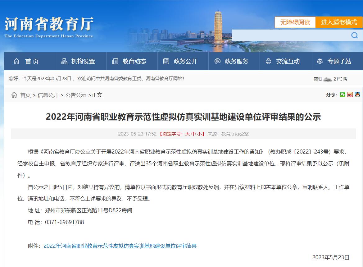 近日,河南省教育厅发布《2022年河南省职业教育示范性虚拟仿真实训基地建设单位评审结果的公示》,我校“先进制造技术虚拟仿真实训基地”获批成为河南省职业教育示范性虚拟仿真实训基地建设项目。近年来学校紧盯