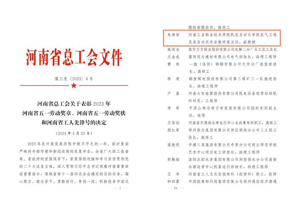 近日,河南省总工会下发《关于表彰2023年河南省五一劳动奖章、河南省五一劳动奖状和河南省工人先锋号的决定》(豫工发[2023]6号),我校自动化工程学院教师朱清智荣获河南省五一劳动奖章。朱清智,河南工