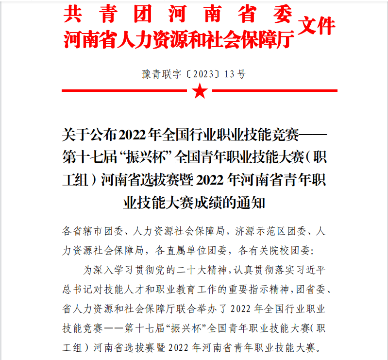 近日,共青团河南省委、河南省人力资源和社会保障厅联合印发的《关于公布2022年全国行业职业技能竞赛第十七届“振兴杯”全国青年职业技能大赛(职工组)河南省选拔赛暨2022年河南省青年职业技能大赛成绩的通