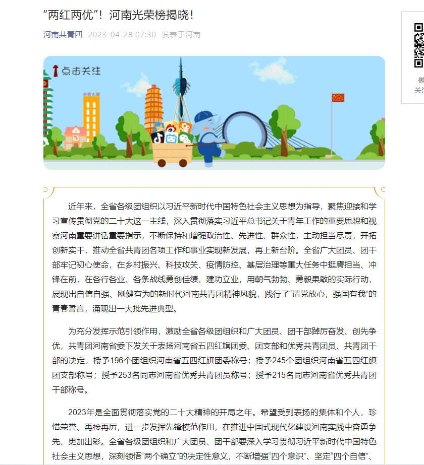 2023年4月,共青团河南省委下发关于表扬河南省“两红两优”的决定,授予245个团组织河南省五四红旗团支部称号,学校文化旅游与国际教育学院团总支光荣上榜。近年来,在学校党委的正确领导下,在学校团委和文