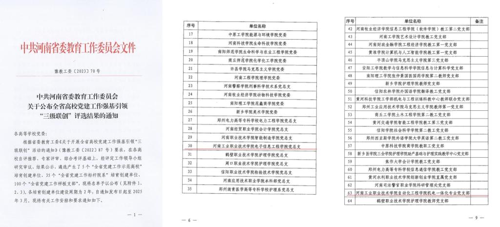 近日,省委教育工委发布了全省高校党建工作强基引领“三级联创”及基层党建创新典型案例评选结果,我校电子信息工程学院党总支被评选为“全省党建工作标杆院系”培育创建单位、自动化工程学院机电一体化技术专业党支