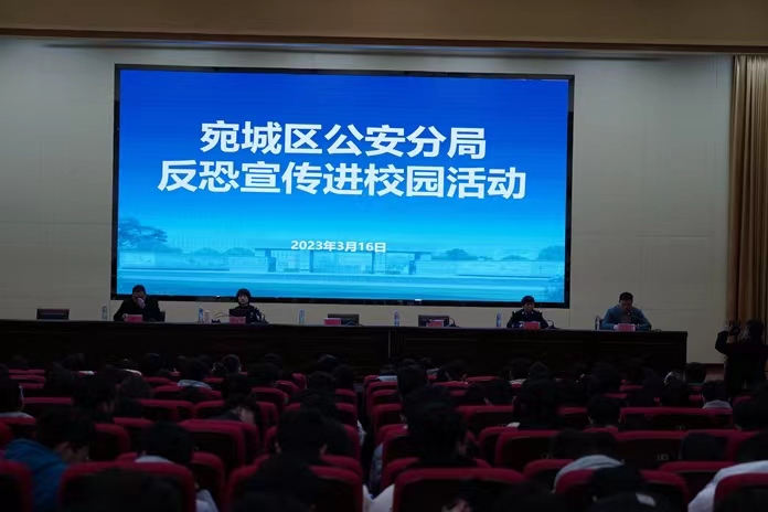 校园安全无小事,安全责任大如天。为进一步增强师生员工的反恐防范及识诈、防诈意识及能力,切实保障师生生命安全及财产安全,维护学校正常的教育教学秩序。3月16日晚,学校邀请宛城区公安分局来校,在大学术报告