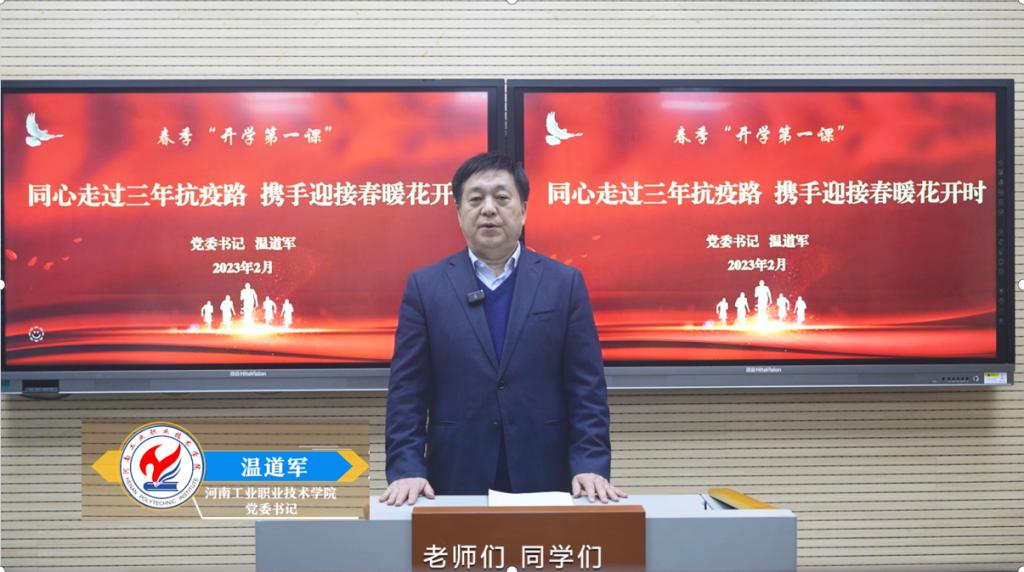 为贯彻落实好2023年全省教育工作会议精神,根据河南省委教育工委、省教育厅关于做好2023年春季“开学第一课”相关工作要求,2月13日,在新学期上课第一天,学校党委书记温道军、校长王伟带头上讲台讲授春