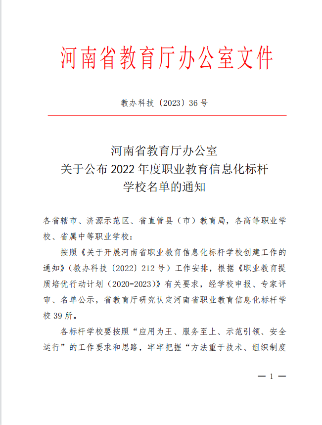 近日,河南省教育厅发布《河南省教育厅办公室关于公布2022年度职业教育信息化标杆学校名单的通知》(教办科技〔2023〕36号),我校以优异成绩成功入选。“河南省职业教育信息化标杆学校”创建工作是省教育