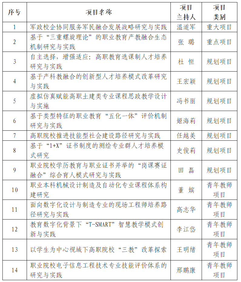 日前,河南省教育厅发布了《关于公布2022年河南省职业教育教学改革研究与实践项目立项项目名单的通知》,我校共有14项获批立项,立项数量位列河南省高职院校前列,其中《军政校企协同服务军民融合发展战略研究
