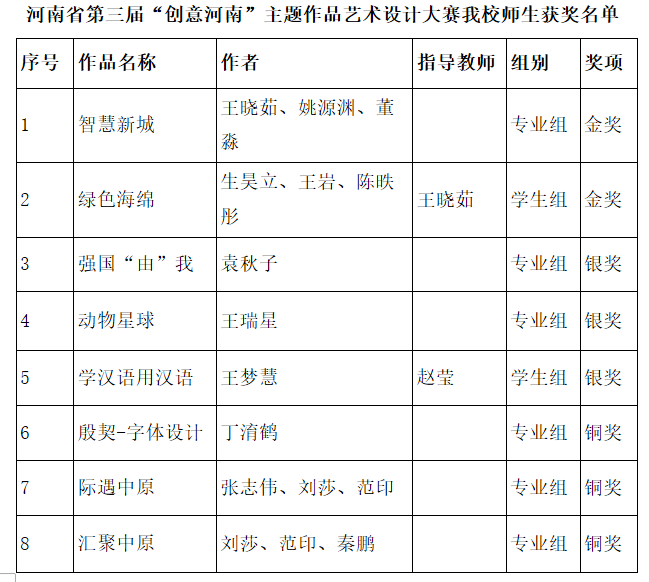 近日,河南省教育厅发布《关于公布河南省第三届“创意河南”主题作品艺术设计大赛评审结果的通知》,我校8件作品入围,共斩获金奖2项,银奖3项,铜奖3项,总体成绩优异,学校荣获优秀组织奖。教师王晓茹、姚源渊