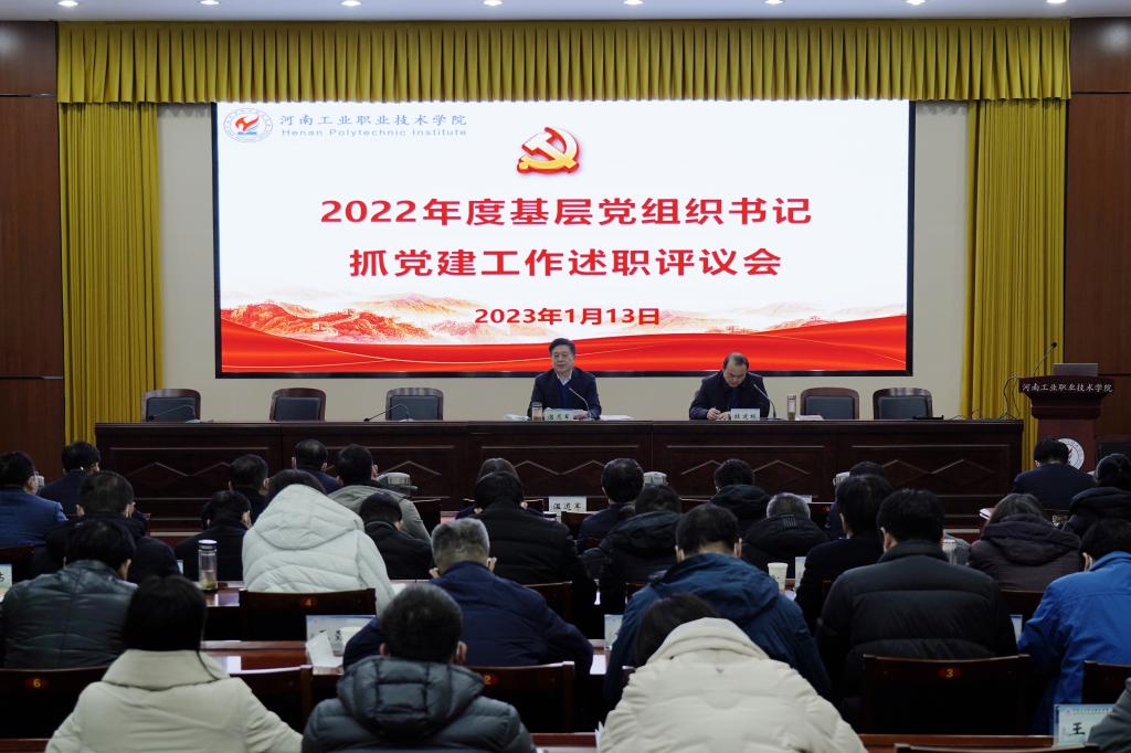 1月13日下午,学校在孔明路校区第一会议室召开2022年度党组织书记抓基层党建工作述职评议考核会议。校领导温道军、王伟、杜建根、贾庆成、李荣胜、屈保中出席会议,全体中层正职干部、部分基层党支部书记代表