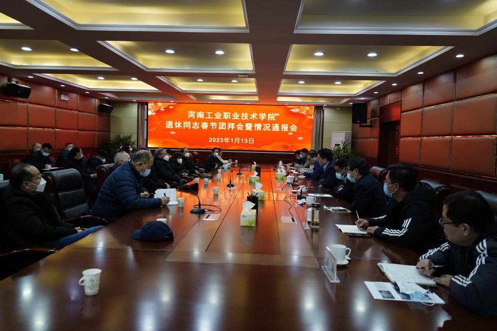 1月13日,学校在孔明路校区行政楼四楼会议室召开退休同志春节团拜会暨情况通报会。党委书记温道军、校长王伟、党委副书记杜建根出席,学校党政办、党委组织部、党委宣传部、党委教师工作部、党委武装部、后勤服务