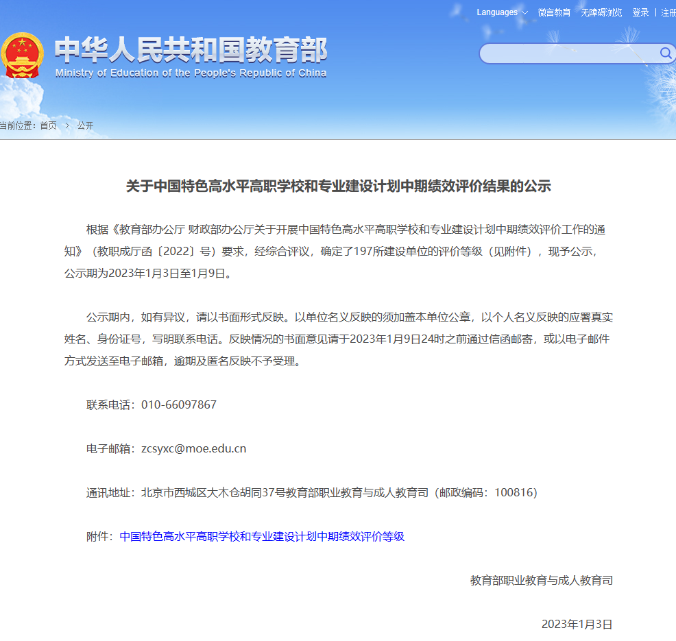 日前,教育部职业教育与成人教育司发布《关于中国特色高水平高职学校和专业建设计划中期绩效评价结果的公示》,根据《教育部办公厅财政部办公厅关于开展中国特色高水平高职学校和专业建设计划中期绩效评价工作的通知