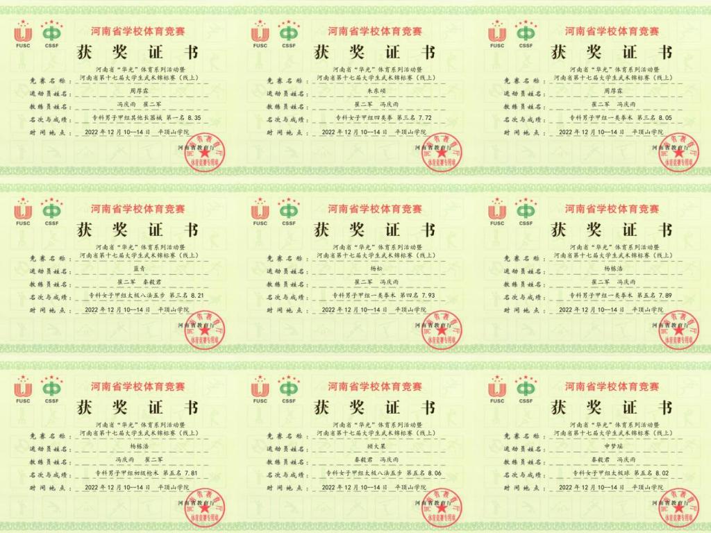 2022年12月11日至31日,由河南省教育厅主办、河南省学生体育总会武术协会执行、平顶山学院承办的2022年河南省“华光”体育系列活动暨第十七届大学生武术锦标赛落下帷幕。共有来自全省89所学校的10