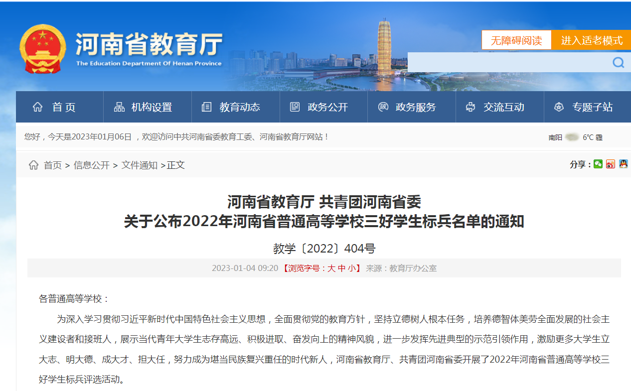 近日,河南省教育厅、共青团河南省委公布2022年河南省普通高等学校三好学生标兵名单,我校丁玉冰同学荣获河南省普通高等学校三好学生标兵荣誉称号。此次活动由河南省教育厅、共青团河南省委主办,大力展示当代青