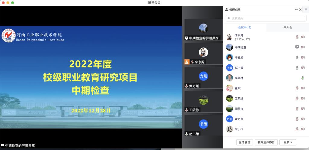 12月28日,学校召开2022年度校级职业教育研究重大项目中期检查汇报会,会议通过线上方式进行。招生就业处处长胡雪梅、质量管理办公室主任罗萍、督导室李孔昭教授、徐荣政教授、李华林教授等专家与会,重大课