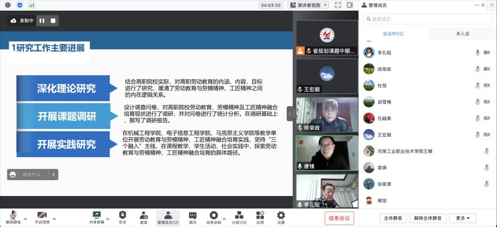 12月15日,学校召开2022年度河南省教育科学规划一般课题中期检查汇报会,会议通过线上腾讯会议方式进行。教务处处长杜恒、招生就业处处长胡雪梅、督导室李孔昭、徐荣政等校内外专家与会,7个课题组全体成员