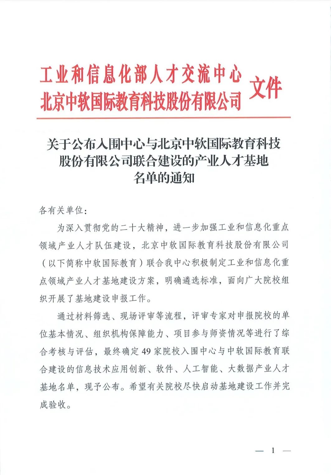 12月13日,工业和信息化部人才交流中心发布《关于公布入围中心与北京中软国际教育科技股份有限公司联合建设的产业人才基地名单的通知》,经专家评审,共有49所高校入围工业和信息化部人才交流中心与中软国际教