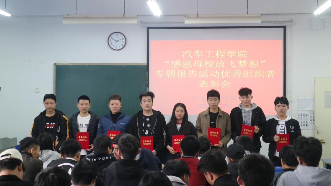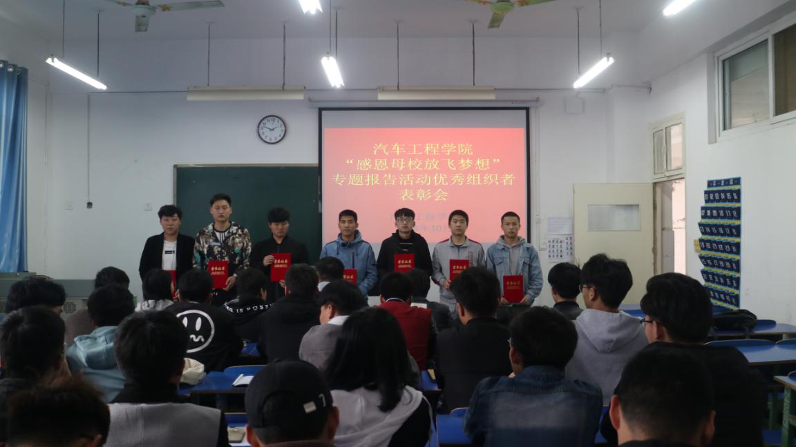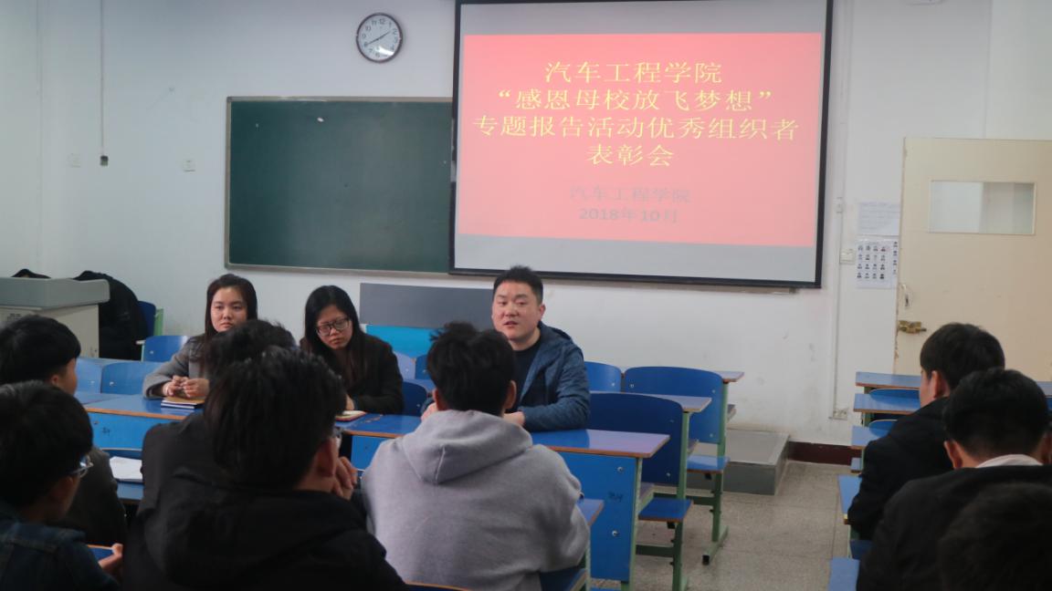 汽车工程学院团总支、学工科2018年10月26日在X2408表彰本学院2018年度感恩母校放飞梦想”专题报告活动优秀组织者们,鼓励他们再接再厉,继续发扬服务同学、共同进步的精神,配合学院做好资助感恩教育工作、进而深化学院资助育人这一德育教育。学工科科长王洪燕主持表彰会,辅导员薛萧萧、辅导员朱晓庆和辅导员张满参与。