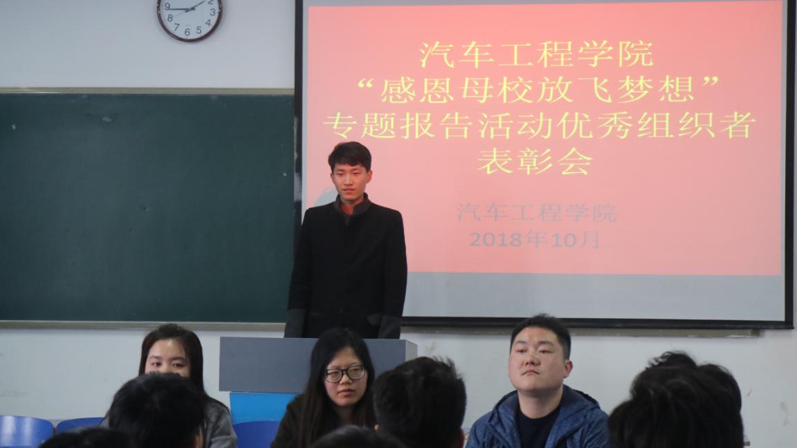 表彰会首先由汽车工程学院学生会主席王岩同学总结各班级在“感恩母校放飞梦想”专题报告中的优秀表现和发现问题。接下来由学生会资助部展示活动精彩瞬间,并宣读优秀组织者入选事迹。最后由资助专干、辅导员老师张满公布最终获奖名单。