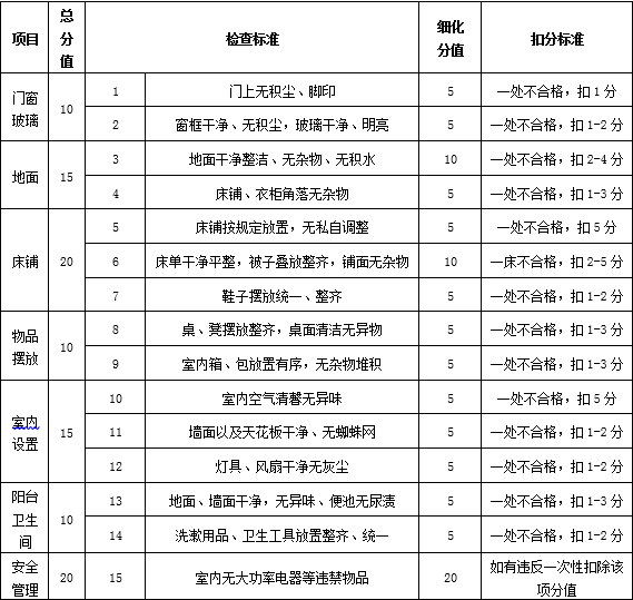 为加强学生劳动意识教育,保持良好的生活、学习环境,自本周起,实行周五学生公寓卫生大扫除及内务整理制度。每周周五下午3:30,学生处牵头,后勤服务中心及各院系配合,对所有学生宿舍开展卫生打扫及内务整理活动。届时,学生处工作人员、后勤服务中心相关人员、全体辅导员、全体班主任参与检查。