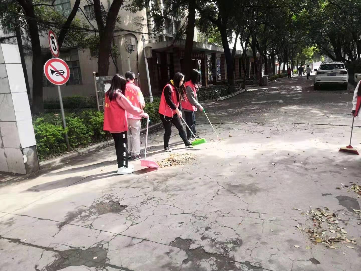 周日下午三点,同学在六号楼外准时集合,在志愿者联络人的带领和监督下,进行两个多小时的清扫活动。各班志愿者在自己卫生区域开始打扫卫生.同学们或是用扫帚堆起来沉积的落叶,或是用手捡起来路边的包装袋,一个同学拿着扫帚,另一个就用工具回收,同学们都在互帮互助中感受集体的力量。在春风和煦的校园中园艺学子认真清扫,默然工作,汗水与尘土齐飞,构成了校园里一道美丽的风景线。