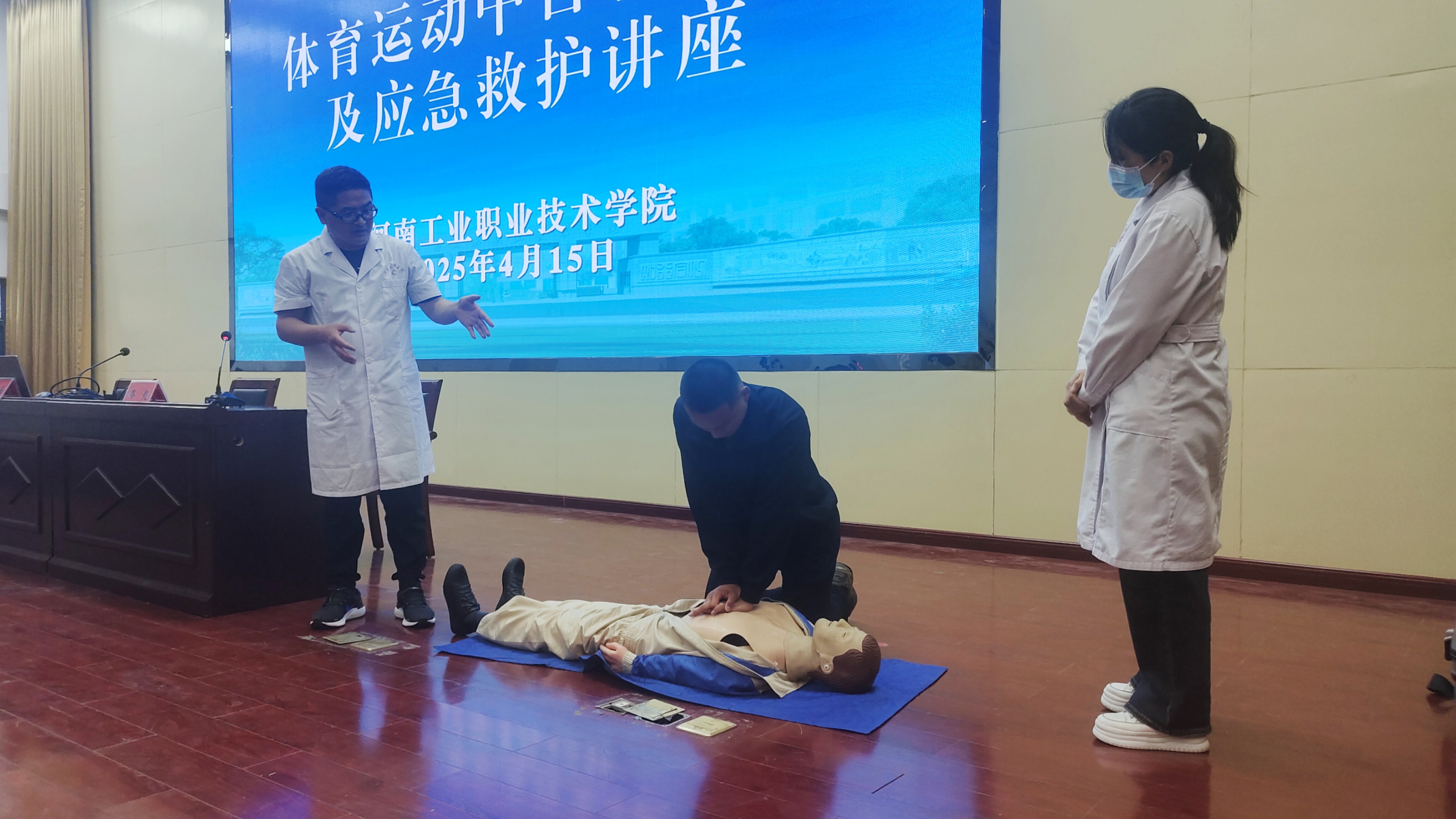 讲座分为两个部分。第一部分由建筑工程学院团总支书记朱宗海为大家系统讲解赛前心理调适、运动状态调整技巧、运动损伤的预防措施,助力同学们以最佳身心状态迎接比赛挑战;第二部分由校医院医务科科长路超聚焦现场应急救护技能,通过理论结合实操演示,让大家掌握关键时刻的急救方法。