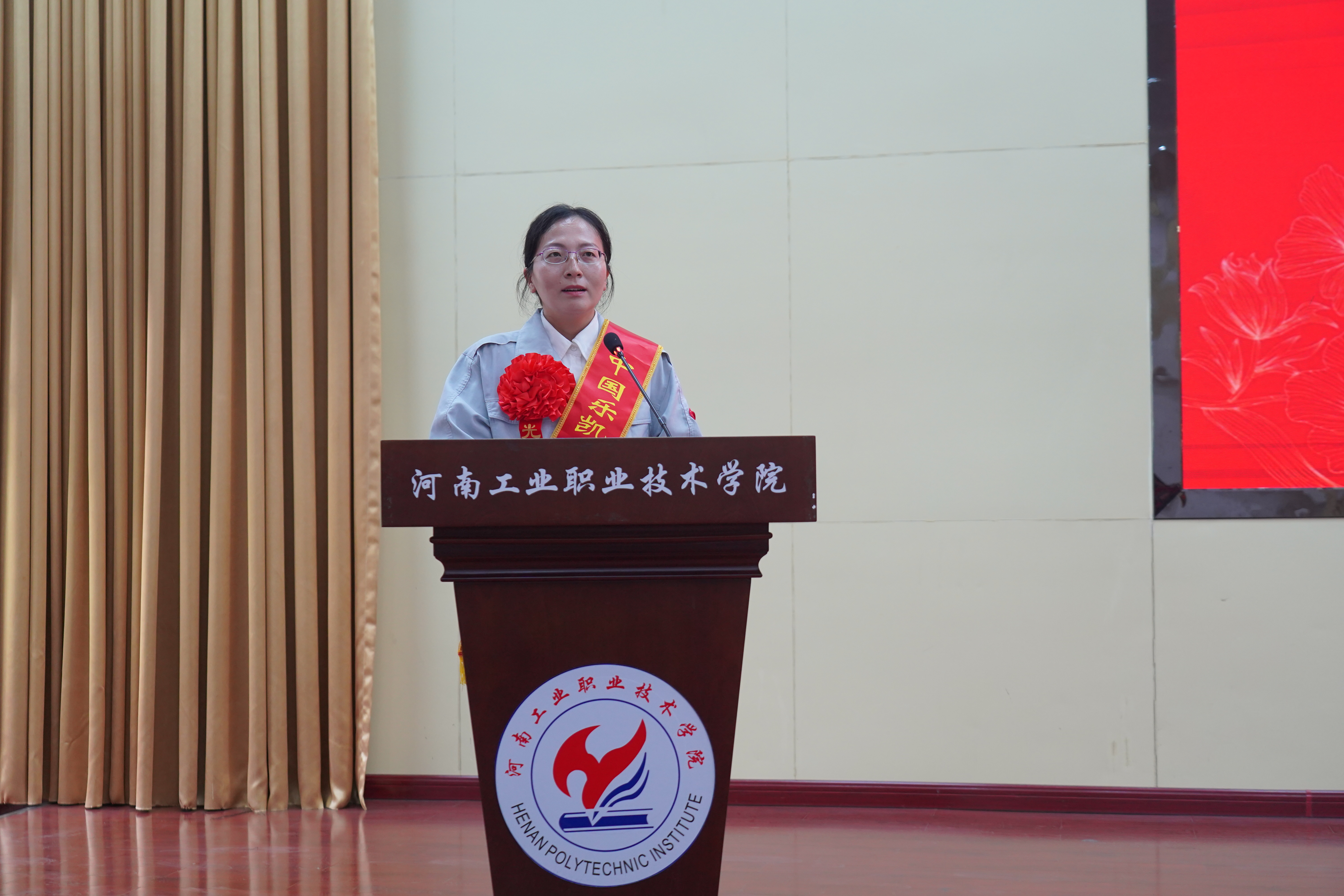 宣讲活动中,4位巾帼劳模用朴实的语言分享了她们的奋斗故事。河南省先进工作者、市政环卫中心女子疏浚班班长吕效果讲述了28年如一日守护城市清洁的坚守;全国五一劳动奖章获得者、南阳市疾控中心传染病预防控制科科长彭阳回顾了抗疫一线的感人瞬间;全国五一巾帼标兵获得者郭雪丽分享了电力技术创新的艰辛与成就;乐凯华光“巾帼建功标兵”刘佳茵则以自身经历诠释了打破性别标签、勇敢追梦的励志故事。她们的讲述深深打动了在场师生,现场掌声不断。
