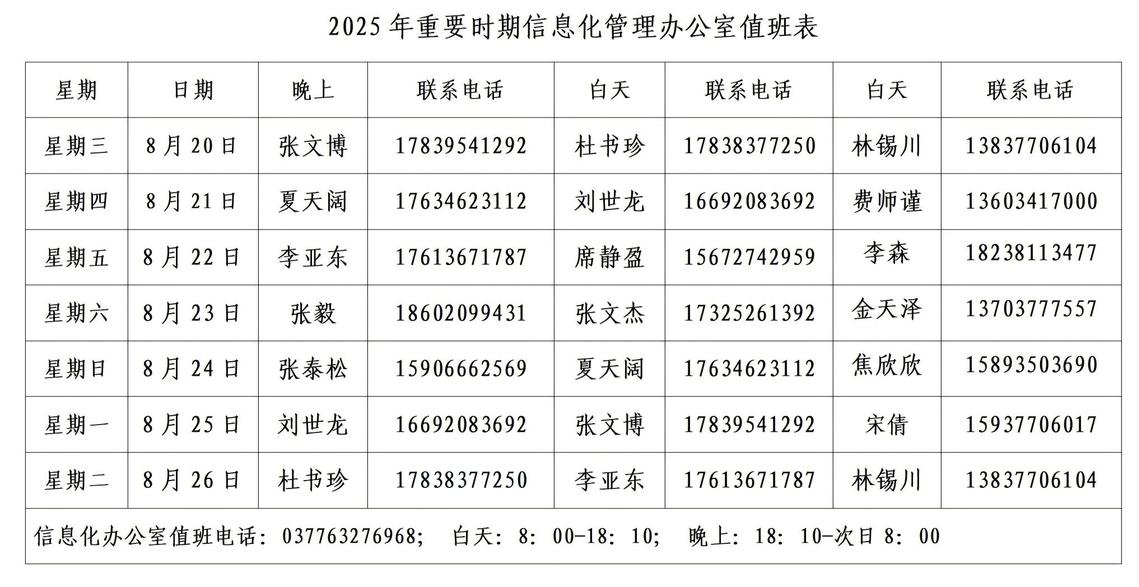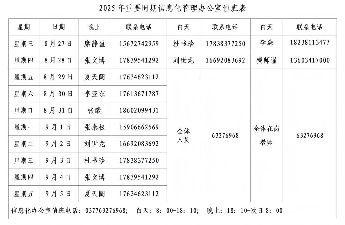 2025年下半年重要时期信息化管理办公室值班表